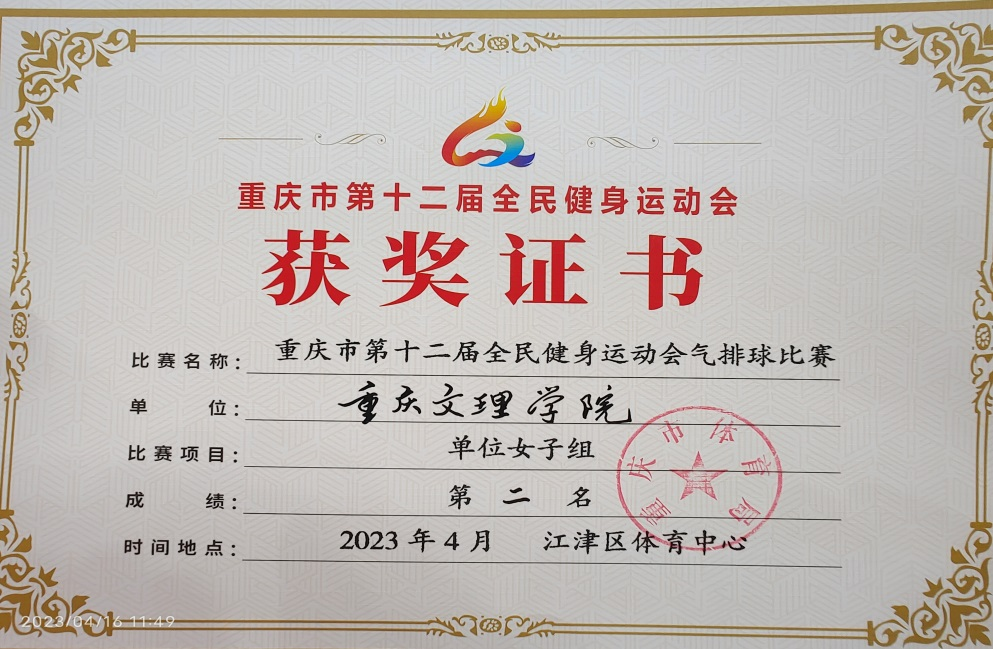 4月16日,重庆市第十二届全民健身运动会气排球比赛落下帷幕,来自全市26个区县的78支代表队齐聚江津展开了精彩对决。本次全民健身运动会气排球比赛分区县组和机关、企事业单位和行业协会组,其中单位女子组有重庆市公安局、火车头体协、mansion88明升、江津教育、重庆市第二师范等十二支队伍报名参赛。文理学院女子气排球队发挥出色,获得亚军。